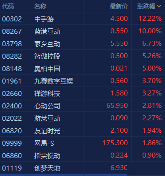 港股手游股全线拉升上扬,中手游涨幅扩大至超12%创历史新高,家乡互动涨超6%,心动公司涨近3%,网易、创梦天地均有涨幅。