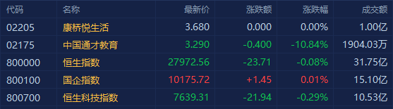 港股三大指数开盘涨跌不一,恒指跌0.08%报27972点,国指涨0.01%报10175点,恒生科技指数跌0.29%报7639点。