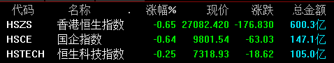 港股三大指数短线下挫,恒指、国指均跌超0.6%,恒生科技指数跌0.2%。此前三只皆升超0.3%。
