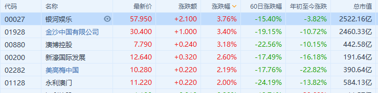 濠赌股走强,银娱、金沙、澳博均涨超3%,新濠国际、美高梅中国涨超2%。个股方面,金沙中国2021年第二季的净收益总额同比增长20.2倍至8.49亿美元;第二季的净亏损为1.66亿美元,较去年同期的5.49亿美元收窄。板块上,摩通近日发研报指,尽管由年初至今,濠赌股的股价已调整了14%,但该行仍然看好澳门**业,予六只濠赌股“增持”评级。虽然摩通对广东和香港疫情爆发和重新通关进展缓慢感到失望,但强调澳门仍是通关的滞后得益者,又认为澳门的长期价值高,相信本月起需求将逐步好转,而港澳旅游限制可望于第四季放宽。此前花旗亦上调澳门7月赌收预测至85亿澳门元,认为广东省放宽跨境交通管制后,游客人数逐渐恢复。