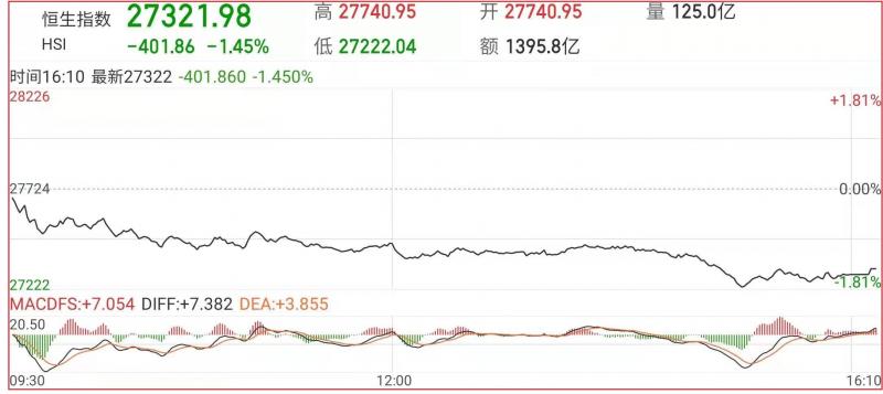 1.上周五恒指今早先轻微高开17点至27740点,其后由于买盘不继,加上伺高回吐之沽压亦渐增,故整个大市卒开始缓步回软。至上午11时左近计,恒指已一度急回305点至27418点,港股高开低走,截至收盘,港股恒指跌1.45%,报27321.98点,国企指数跌1.67%,红筹指数跌0.34%;