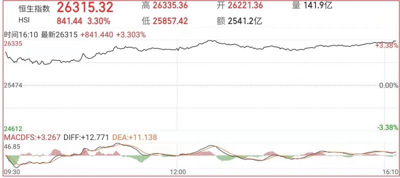 1.恒指昨早市先大幅高开748点至26221点,但由于高台买盘保守,故升势未能持续,其后在伺高回吐之沽压涌现下,市势开始再见反复,午后恒指涨幅进一步扩大。截至收盘,恒生指数3.3%,报26315.32点,国企指数涨3.8%,报9415.69点,红筹指数涨0.92%,报3640.62点;