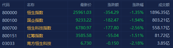 昨日迎暴力反弹的港股市场再度大跌,三大指数午后跌幅虽有所收窄,但仍有较大跌幅,市场再度陷入低迷。截至收盘,恒指跌1.35%报25961点,国指跌1.94%报9233点,恒生科技指数跌2.56%报6780点,盘中一度暴跌近5%。