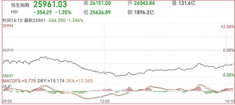 1.上周五恒指早市先低开273点至26042点,其后一直在此水平左近拉锯,反复徘徊于25930点至26088点之间。午后恒指先抑后扬,尾盘跌幅收窄,截至收盘,恒生指数1.35%,国企指数跌1.94%,红筹指数跌1.51%;