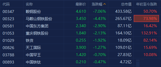 鞍钢股份跌7%领衔下跌,马鞍山钢铁跌近5%,重庆钢铁、中国东方集团皆跌逾2%。A股鞍钢股份、马钢亦跌超4%。中钢协报告表示,钢材市场价格经历了5月份的大起大落后,6、7月份窄幅波动。下一步如果供需相对平衡,钢价有望稳定在这一区间。但铁矿石价格仍继续升高、其它原燃料价格也普遍上涨,钢铁企业成本上升,盈利空间将受到挤压。随著政策调控效果的进一步显现,钢材出口量或将呈下降态势。