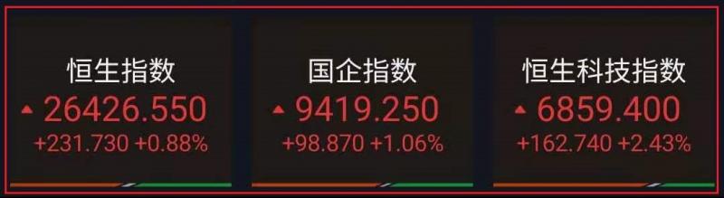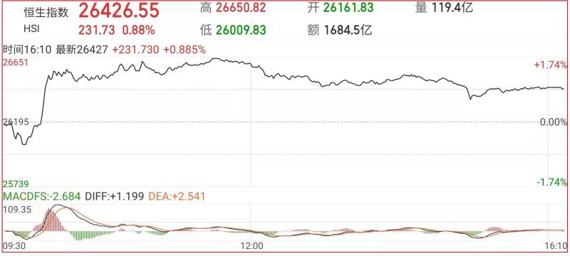 1.恒指昨早市先轻微低开313点至26161点,其后曾再稍回落至26009点。惟由于沽压并不明显,加上维稳买盘亦渐见主动,故整个大市卒开始掉头上升,午后恒指涨幅收窄。截至收盘,恒生指数0.88%,报26426.55点,国企指数涨1.06%,报9419.25点,红筹指数跌0.09%,报3706.04点;