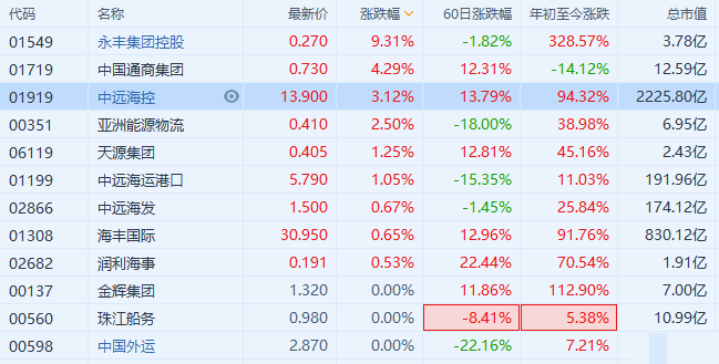 港口航运股普涨,永丰集团控股涨超9%,中远海控涨超3%,中远海运港口、中远海发、海丰国际等跟涨。个股方面,港交所权益资料显示,中远海控获摩根士丹利于8月3日在场内涉资约7988万港元增持625.37万股,增持后其持股比例由6.83%增持至7.01%。板块上,波罗的海整体干散货运价指数上周五(6日)小幅回落,下滑5点或0.2%至3371点;该指数周线升2.4%,连升第三周。此外据悉,由于在美国购物旺季到来之前零售商订单不断增加,加大全球供应链面临的压力,从中国至美国的集装箱运价已涨至每40英尺箱子20000美元以上的新高。海运咨询公司Drewry的董事总经理Philip Damas预计这种 “极端运价”将持续到2022年的中国农历新年。