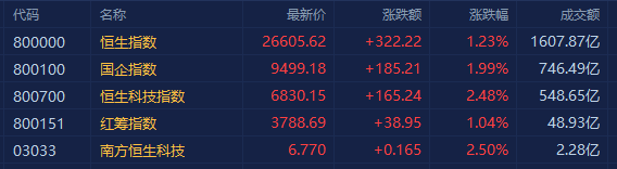 港股主要指数全线收涨,三大指数早盘小幅回落后持续拉升,尾盘涨幅进一步扩大。截至收盘,恒指涨1.23%报26605点,国指涨1.99%报9499点,恒生科技指数涨2.48%报6830点。