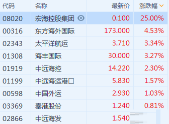 港口航运股走强,东方海外国际(0316.HK)涨4.5%,太平洋航运(2343.HK)、海丰国际(1308.HK)涨超3%。消息面上,波罗的海干散货运价指数周三涨约1%,为6月29日以来最高水平。全球集装箱货运指数显示,中国、东南亚至北美东海岸的海运价格,首次超过了每标箱2万美元。