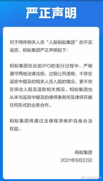 蚂蚁集团发布声明公告称,网传相关人员入股蚂蚁集团是谣言。蚂蚁集团在声明中表示,蚂蚁集团在此前IPO的发行过程中,严格遵守两地法律法规,过程公开透明,不存在谣言中提及的相关人员入股的情况,更不存在突击入股及退款相关情况。蚂蚁集团表示,从未与谣言中提及的律师事务所及律师开展任何形式的业务合作,将通过法律程序维护自身合法权益。