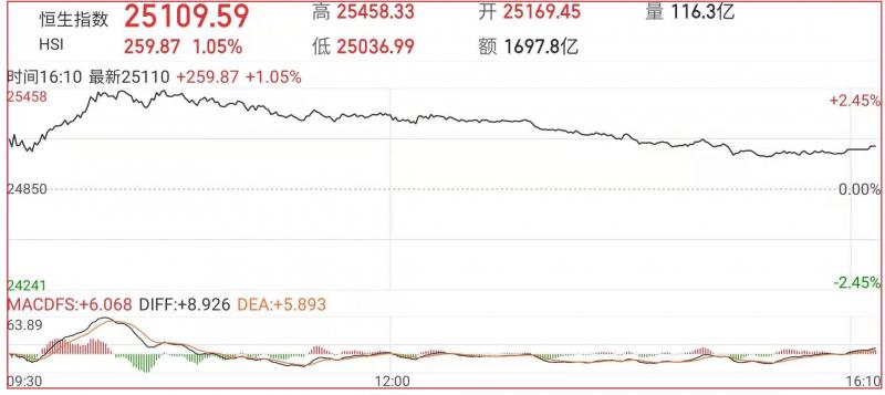 1.恒指昨早市先高开320点至25169点,其后稍作拉锯而轻回至25061点。惟在买盘支持下,大市再度回升,一度涨超2%,午后涨幅收窄。截至收盘,港股恒指涨1.05%,报25109.59点,国企指数涨0.84%,红筹指数涨1.06%;