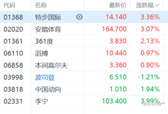 体育用品股走势分化,特步、安踏涨超3%,361度涨超2%;中国动向跌近2%,昨日盘中高见108.2港元创历史新高的李宁今日高开低走,现跌约4%。