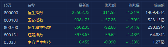 港股三大指数早盘震荡,午后快速下跌,市场情绪表现低迷。截至收盘,恒指跌1.21%报25502点,国指跌1.7%报9081点,恒生科技指数跌1.41%报6501点。