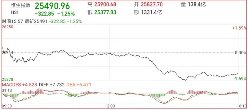 1.恒指走势反复,昨港股高开,此后一度跌超0.5%,临近午盘,恒指跌幅收窄,午后恒指跳水大跌,截至收盘,恒指跌1.21%,报25502.23点,国企指数跌1.7%,红筹指数涨1.48%;