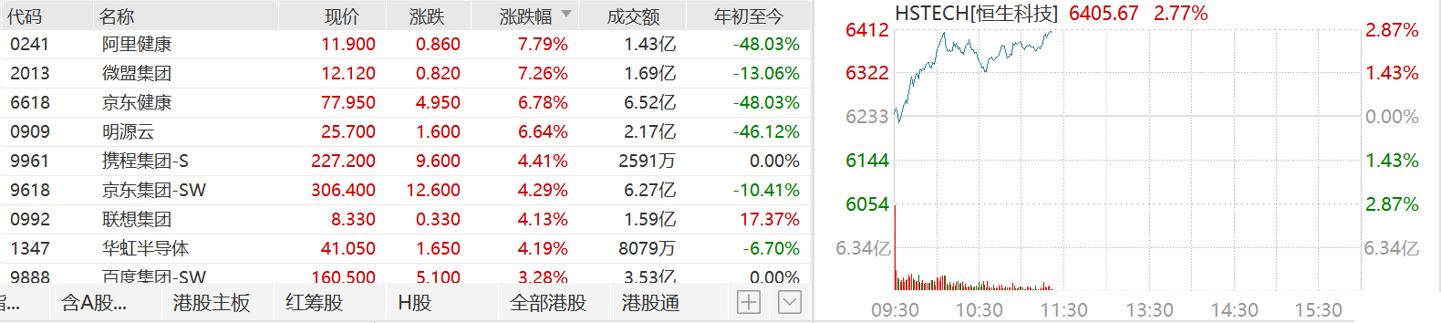 港股科技股进一步走强,带动恒生科技指数涨近3%。阿里健康和微盟集团涨超7%领涨成分股,京东健康和明源云涨近7%,携程、京东集团、联想集团和华虹半导体涨超4%。大市值科技股中,腾讯涨2.66%,阿里巴巴涨1.7%,美团、快手和百度涨超3%。