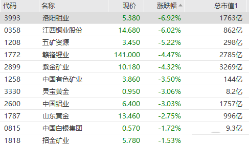 港股有色金属板块走低,洛阳钼业跌近7%,江西铜业股份跌超6%,五矿资源跌超5%,紫金矿业、赣锋锂业、中国铝业等纷纷下跌。