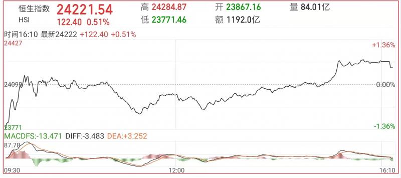 1.周二港股指数午后震荡回暖,地产、**、环保、电力、物管板块领涨,科技股走弱,汽车、餐饮、银行、医药、烟草等板块表现低迷。港股低开高走,截至收盘,恒生指数涨0.51%,报24221.54点,国企指数涨0.02%,红筹指数涨1.23%;