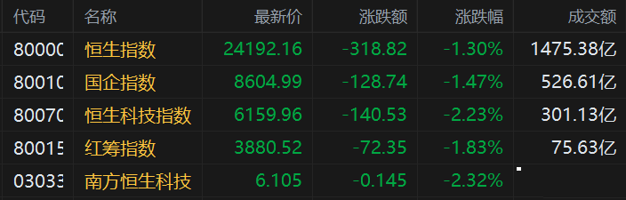 港股三大指数午后跌幅持续扩大,市场情绪表现较弱。截止收盘,恒指跌1.3%报24192点下挫超300点,国指跌1.47%报8604点,恒生科技指数跌2.23%报6159点。