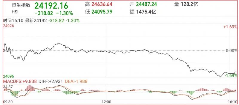 1.上周五恒指早先轻微低开23点至24487点,其后曾一度倒升至24621点,但由于买盘却步,加上零碎沽压再现,故整个大市卒又再渐转反复并且缓步回落,截至收盘,恒生指数跌1.30%,报24192.16点,国企指数跌1.47%,红筹指数跌1.83%;