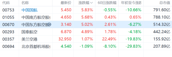 上周五(1日)美股航空股大涨,今日港股市场航空股集体走强。中国国航、南航、东航均涨超5%,国泰航空涨超4%,美兰空港涨超1%。