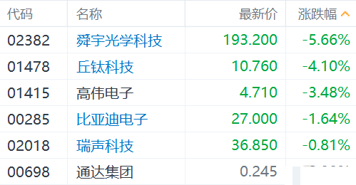 港股市场苹果概念股今日普跌,其中,舜宇跌超5%领跌,丘钛科技跌超4%,高伟电子跌超3%,比亚迪电子跌超1%,瑞声科技跌0.81%。苹果上周五美股盘中一度跌1.69%至139.11美元,触及120日均线,股价创今年7月以来新低,尾盘回升最终收涨0.81%。