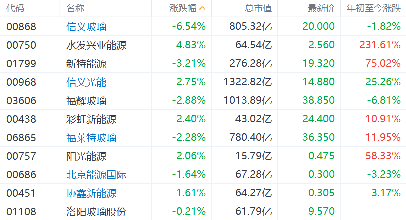 延续昨日跌势,港股光伏股今日继续下跌。其中,信义玻璃跌超6%,水发兴业能源跌近5%,新特能源跌超3%,信义光能、福耀玻璃、福莱特玻璃和阳光能源跌超2%,协鑫新能源跌超1%。