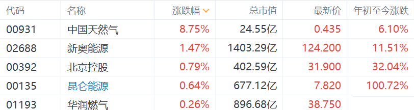 港股燃气股集体高开,其中,中国天然气涨近9%,新奥能源涨1.47%,昆仑能源和华润燃气处于上涨中。由于对冬季到来前供应的担忧,荷兰TTF天然气价格(欧洲的基准天然气价格)继续上涨,周二首次飙升至每兆瓦时100欧元以上,升至新的纪录高位,目前已相当于每桶230美元的油价。分析师称,欧洲的能源危机仍在继续恶化,且看不到立即缓解的迹象。