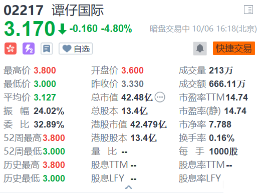 谭仔国际(2217.HK)暗盘段现报3.17港元,较发行价3.33港元跌4.8%,总市值42.5亿港元。