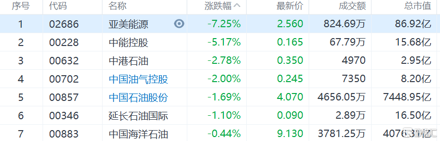 油气股普跌,亚美能源跌逾7%,中能控股跌逾5%,三桶油方面,中石油跌1.69%,中海油跌0.44%。