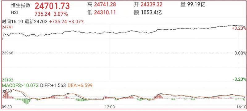 1.恒指昨早市先高开373点至24339点,其后曾稍回至24310点,惟在买盘支持下,随后涨幅扩大。截至收盘,恒生指数涨3.07%,报24701.73点;国企指数涨3.57%,红筹指数涨0.82%;