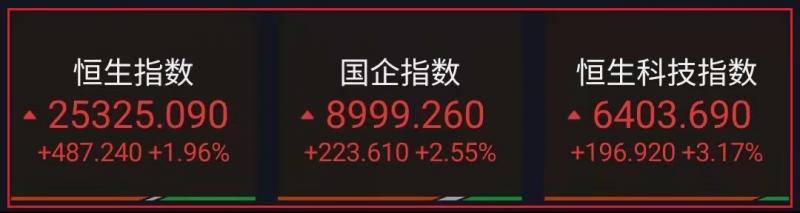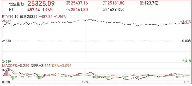 1.恒生指数昨早市先高开324点至25161点,其后在买盘主导下再进一步上升,港股在25350点上下震荡,截至收盘,港股恒指1.96%,报125325.09点;国企指数涨2.55%,红筹指数跌0.13%;