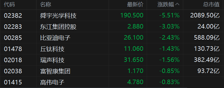 舜宇跌5.5%领跌,比亚迪电子跌2.43%,丘钛科技、瑞声跌1.4%,富智康集团、高伟电子跟跌。