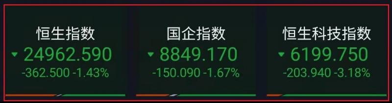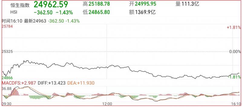 1.恒指昨早市先低开330点至24995点,其后在零碎沽压涌现下再进一步跌至24903点方渐见喘定,即其时大市已一度急回422点,午后恒指跌幅进一步扩大,截至收盘,港股恒指跌1.43%,报24962.59点,国企指数跌1.67%,红筹指数跌0.51%;