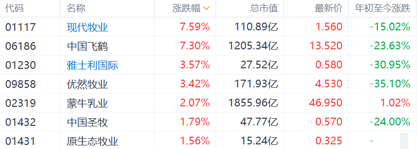 现代牧业和中国飞鹤涨超7%,雅士利国际和优然牧业涨超3%,蒙牛乳业涨超2%,中国圣牧和原生态牧业涨超1%。