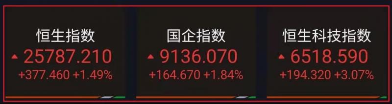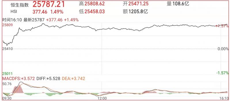 1.恒指昨早市先高开62点至25471点,即此刻已升越本月11日之高位25437点。其后曾略作拉锯而低见25458点,但在维稳买盘支持下,大市又再进一步推上。截至收盘,恒生指数涨1.49%,报25787.21点,国企指数涨1.84%,红筹指数涨0.86%;