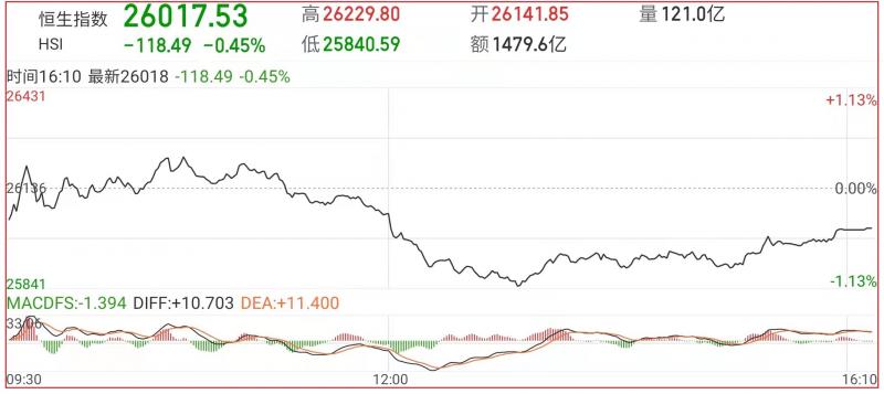 1.恒指昨早市先轻微高开5点至26141点,其后曾略作拉锯而低见26020点,惟在维稳买盘支持下,大市再缓步升至26229点。午后跌幅扩大。截至收盘,恒生指数跌0.45%,报26017.53点,国企指数跌0.03%,红筹指数涨0.34%;
