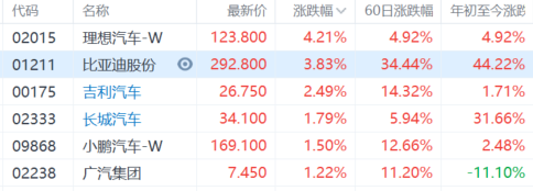汽车股普涨,比亚迪(1211.HK)涨近4%,盘中高见296.2港元创历史新高,今年迄今已累涨超40%;理想汽车涨超4%,吉利汽车涨超2%,长城汽车、小鹏汽车、广汽集团均涨超1%。隔夜美股特斯拉带动新能源车股集体走强,美东时间周三盘后,特斯拉公布了2021年第三季度财报,营收和净利润均创下历史新高。小鹏汽车CEO何小鹏近日表示,到2025年,新能源汽车预计将占中国新车销量的35%以上。当被问及影响全球汽车行业的芯片供应短缺问题时,何小鹏表示,未来12个月芯片供应仍将是一个挑战,但情况将“逐渐好转”。此前工信部新闻发言人、运行监测协调局局长罗俊杰也表示,截至目前,汽车产业受芯片短缺的影响还比较明显,但是综合各种意向看,预计四季度相比三季度会有所缓解。