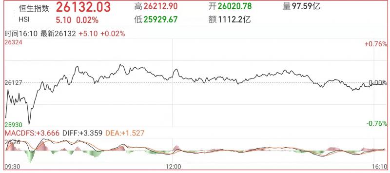 1.恒指昨早市先低开106点至26020点,其后在拉锯中曾稍跌197点至25929点,惟在维稳买盘渐现下,市势卒开始止跌回升。截至收盘,恒生指数微涨0.02%,报26132.03点;国企指数跌0.37%,红筹指数涨0.24%;