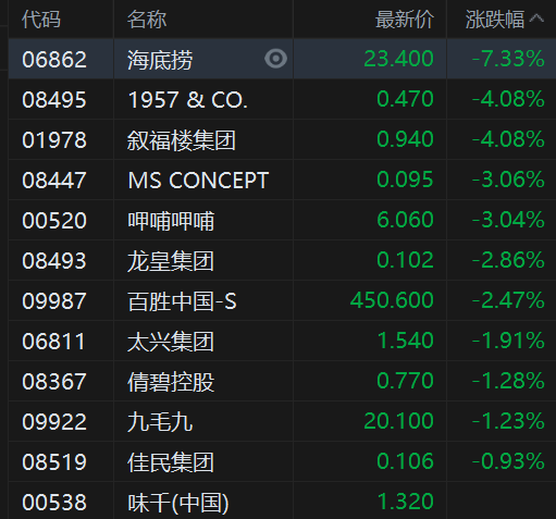 海底捞续跌7.33%已走出5连跌,再创调整以来新低价,且市值跌破1300亿港元;呷哺呷哺跌3%,百胜中国跌2.5%,九毛九跌超1%。目前多地防疫措施加强,四季度餐饮业复苏的不确定性增加,有机构已再度下调餐饮股目标价。瑞信降海底捞目标价至25.5港元,由于表现欠佳分店带来的摊薄,指其复苏较市场同业为慢;美银证券亦下调海底捞目标价至28.7港元,评级中性。将其2021年和2022年的每股盈测分别削减63%和40%,以反映扩张速度放缓及盈利能力下降;瑞银将呷哺呷哺目标价由9.5港元下调至9.3港元。