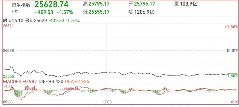 1.恒指早市先低开243点至25795点,其后在回吐沽压涌现下再逐步回落,随后跌幅扩大,恒指一度急跌483点至25555点,截至收盘,恒生指数跌1.57%,报25628.74点;国企指数跌1.79%,红筹指数跌0.14%;
