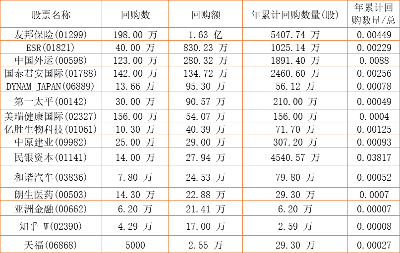 第一太平(00142)、中国外运(00598)、亚洲金融(00662)、民银资本(01141)、美瑞健康国际(02327)、亿胜生物科技(01061)、朗生医药(00503)、国泰君安国际(01788)、友邦保险(01299)、天福(06868)、DYNAM JAPAN(06889)、和谐汽车(03836)、ESR(01821)、中原建业(09982)、知乎-W(02390)于2022年6月27日进行了回购。其中,回购金额最大的为友邦保险(01299),回购数量198.00 万,回购金额1.63 亿元。