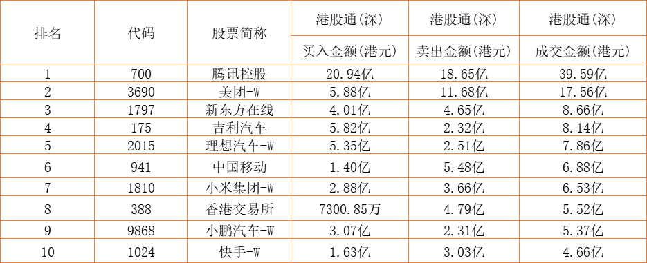 亚汇网实时数据统计:截至6月28日收盘,腾讯控股、美团-W、小米集团-W位居港股通(沪)成交前三,腾讯控股、美团-W、新东方在线位居港股通(深)成交前三。