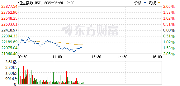 今日开盘,港股恒指低开低走,截至午盘,恒指跌1.63%,报22053.86点,吉利汽车(17.76 -1.30 -6.82%)跌7%,领跌蓝筹。