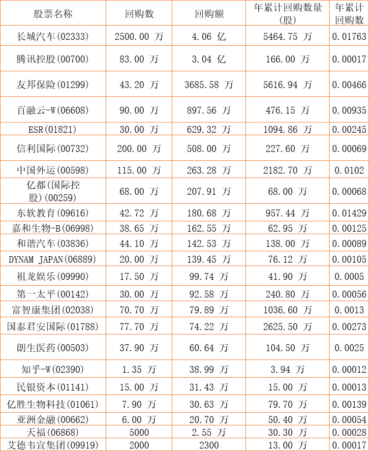 第一太平(00142)、亿都(国际控股)(00259)、中国外运(00598)、亚洲金融(00662)、腾讯控股(00700)、信利国际(00732)、民银资本(01141)、富智康集团(02038)、长城汽车(02333)、亿胜生物科技(01061)、朗生医药(00503)、国泰君安国际(01788)、友邦保险(01299)、天福(06868)、DYNAM JAPAN(06889)、和谐汽车(03836)、ESR(01821)、东软教育(09616)、艾德韦宣集团(09919)、祖龙娱乐(09990)、嘉和生物-B(06998)、百融云-W(06608)、知乎-W(02390)于2022年6月29日进行了回购。其中,回购金额最大的为长城汽车(02333),回购数量2500.00 万,回购金额4.06 亿元。