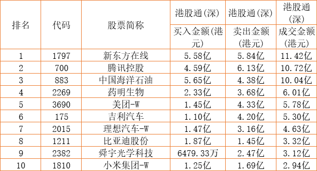 港股通(深)买卖前十股(单位:港元):