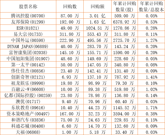 富智康集团(02038)、澳优(01717)、国泰君安国际(01788)、易大宗(01733)、友邦保险(01299)、天福(06868)、DYNAM JAPAN(06889)、和谐汽车(03836)、科通芯城(00400)、中国旭阳集团(01907)、ESR(01821)、东软教育(09616)、艾德韦宣集团(09919)、祖龙娱乐(09990)、百融云-W(06608)、创新奇智(02121)于2022年7月6日进行了回购。其中,回购金额最大的为腾讯控股(00700),回购数量87.00 万,回购金额3.01 亿元。(亚汇网编辑:陌尘)