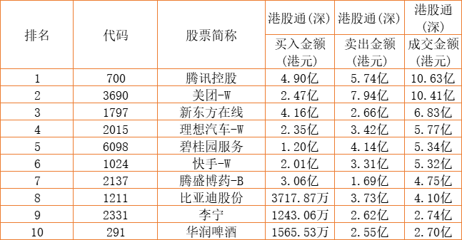港股通(深)买卖前十股(单位:港元):