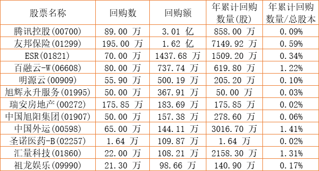 中国外运(00598)、腾讯控股(00700)、亿胜生物科技(01061)、瑞安房地产(00272)、友邦保险(01299)、天福(06868)、DYNAM JAPAN(06889)、和谐汽车(03836)、科通芯城(00400)、汇量科技(01860)、旭辉永升服务(01995)、中国旭阳集团(01907)、ESR(01821)、艾德韦宣集团(09919)、祖龙娱乐(09990)、明源云(00909)、百融云-W(06608)、圣诺医药-B(02257)于2022年7月12日进行了回购。其中,回购金额最大的为腾讯控股(00700),回购数量89.00 万,回购金额3.01 亿元。