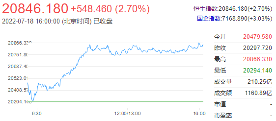 今日早盘,恒指一度转跌,此后暴力反弹,截至收盘,港股恒指涨2.7%,报20846.18点。恒生科技指数(4574.4 134.29 3.02%)大涨3.02%,万国数据涨近7%,哔哩哔哩涨超6%,美团股价大涨近6%,中金预计公司第二季度业绩好于市场预期,维持跑赢行业评级,目标价不变,较当前有56%上行空间。港股后市方面:港股上午以接近高位20820,升523点收市。午后继续升势,维持在高位附近的窄幅区间内波动。在2022年上半年,受累于俄乌战事的爆发、全球疫情的扩散、国大幅加息、孳息率持续倒挂越见严重,及国内房地产的疲弱所影响。