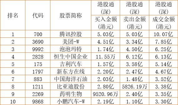 港股通(深)买卖前十股(单位:港元):